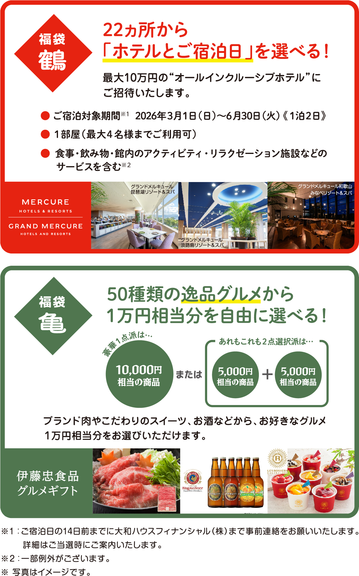期間中、HeartOneカードを合計10,000円(税込)以上ご利用の方の中から、抽選で合計26名様に上記の「鶴」または「亀」の豪華福袋をプレゼントいたします。どちらが当たるかはお楽しみに!
